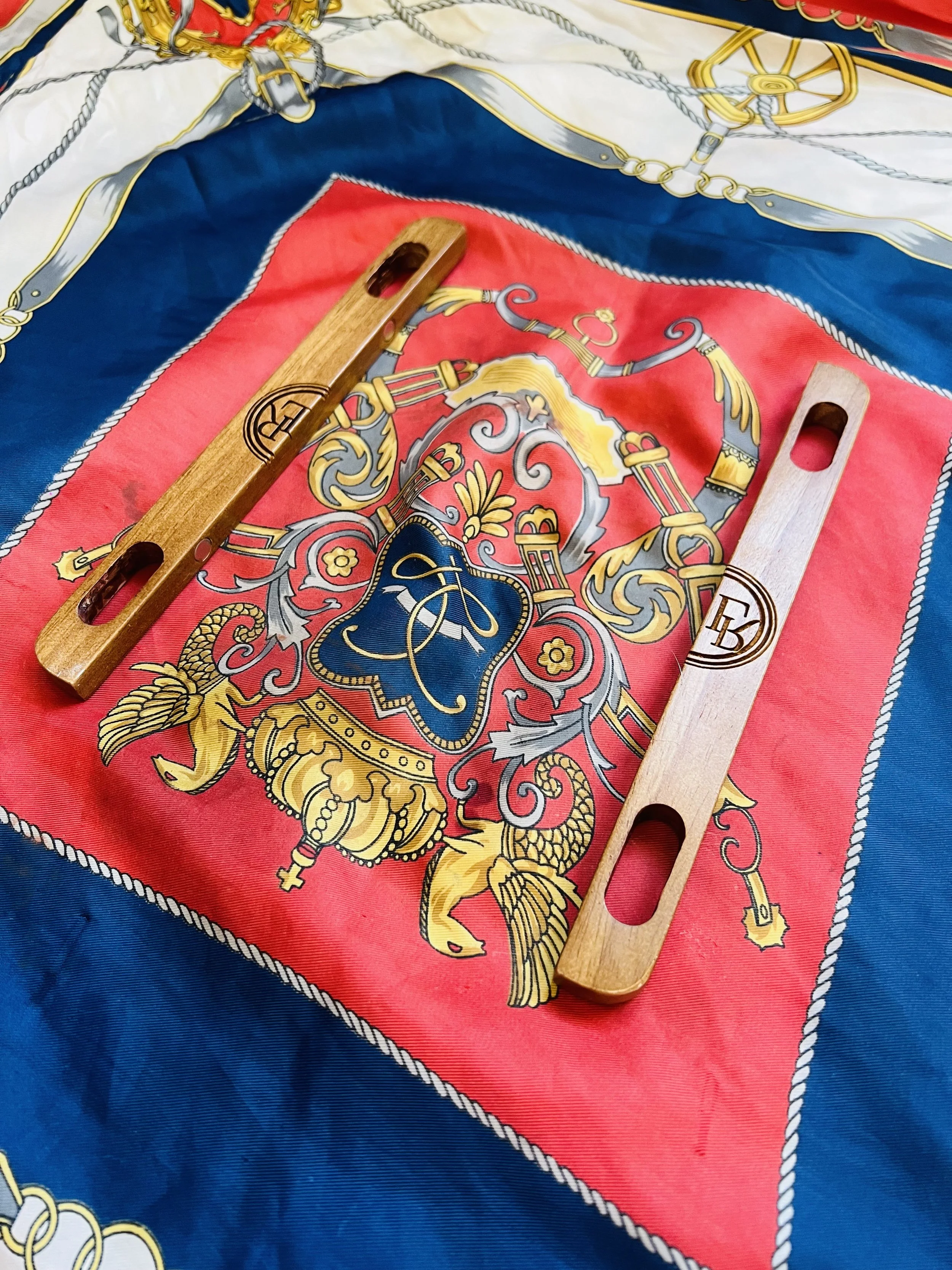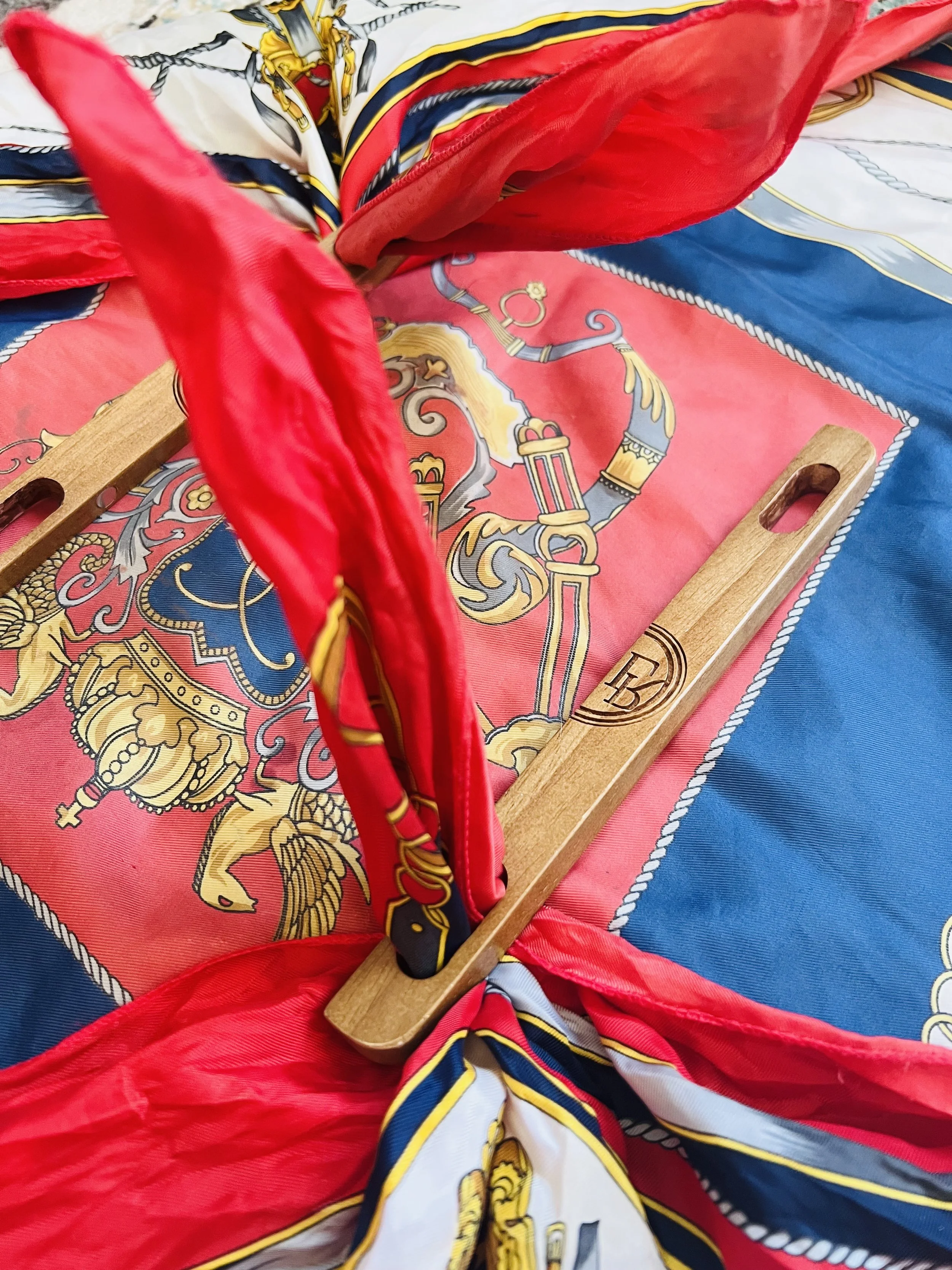 Place the scarf upside-down under the Lady Ripple wooden handles like the photo below: